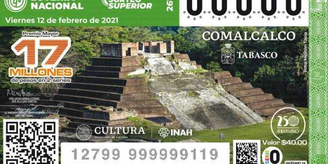 La funcionaria federal informó que el billete alusivo a la Zona Arqueológica de Comalcalco salió a la venta el viernes 6 de febrero, mientras que el sorteo tendrá lugar este viernes 12 de febrero, en una ceremonia que se llevará cabo a las 8 de la noche en el Salón de Sorteos de la Lotería Nacional.