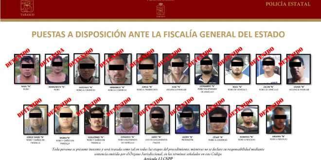 De los detenidos que fueron puestos a disposición de la Fiscalía General del Estado (FGE), cinco fueron por robo a comercios o negocios; cuatro por robo de vehículo o robo equiparado de vehículo; tres por robo y daños en pandilla; dos por violencia familiar; dos por robo en otra modalidad; uno por robo a transeúnte; uno por uso de documentos falsos y uno por pederastia.