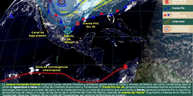 El Instituto de Protección Civil del Estado de Tabasco (IPCET), informó que el Frente Frío número 35 y su masa de aire reforzada, alcanzarán al Estado durante la tarde, favoreciendo cielo nublado y lluvias moderadas, a fuertes aisladas de 25.1 a 50 milímetros, en La Chontalpa y Sierra.