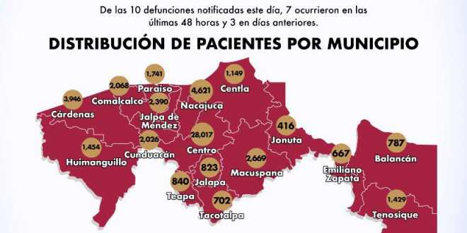 En cuanto a la distribución de pacientes por municipios, Centro concentra el mayor número con 28 mil 017 casos, seguido de Nacajuca, con 4 mil 621; Cárdenas, 3 mil 946 casos; Macuspana, 2 mil 669; Jalpa de Méndez, 2 mil 390; Comalcalco con 2 mil 068 casos y Cunduacán con 2 mil 026 personas infectadas.