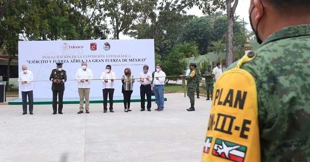 El gobernador Adán Augusto López Hernández acompañado por el comandante de la 30 Zona Militar, José Fausto Torres Sánchez, encabezó este miércoles, la inauguración de la Exposición Fotográfica «Ejército y Fuerza Aérea, la Gran Fuerza de México», con la que se destaca la labor de los militares a favor de la población.