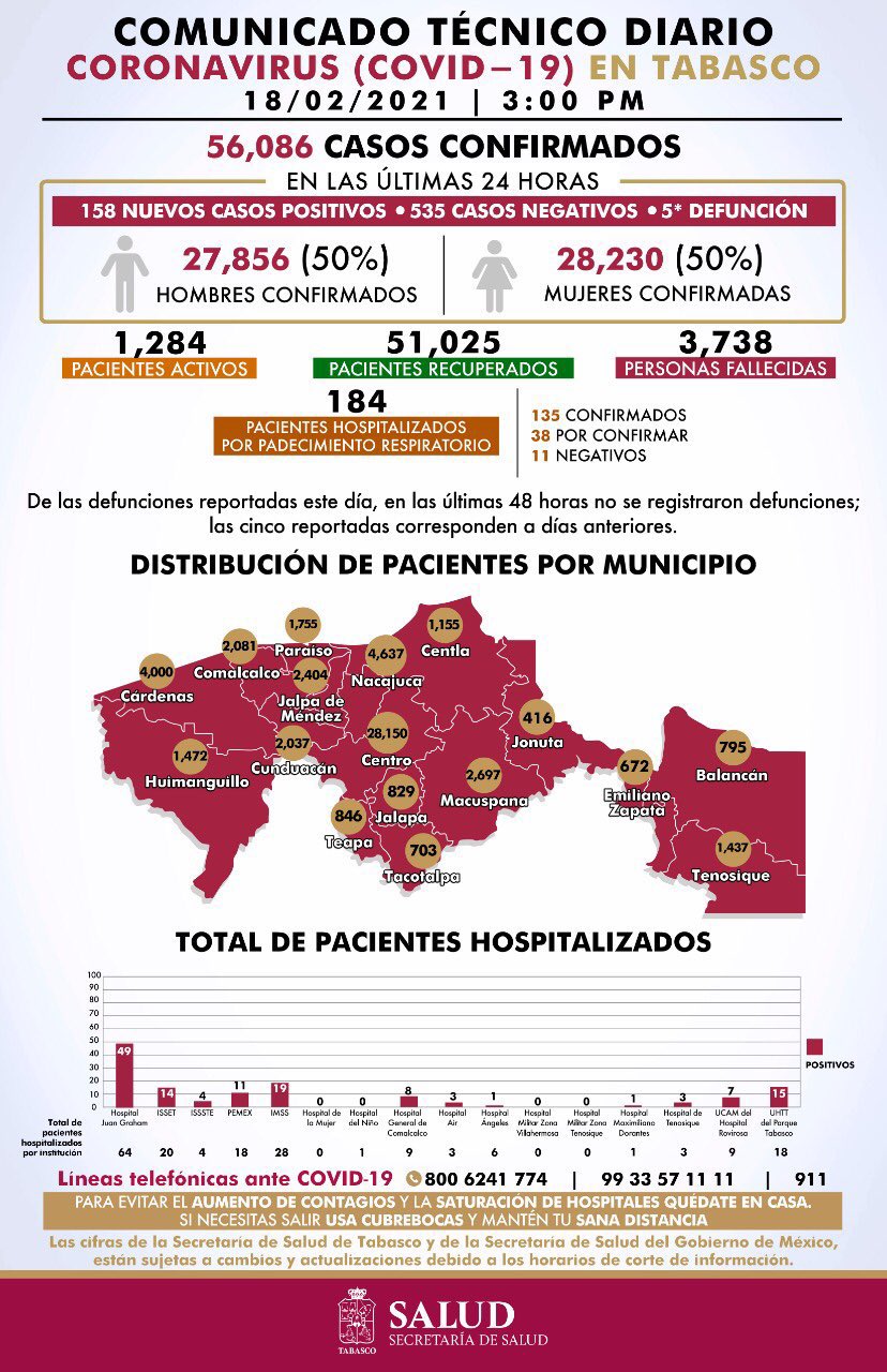 De acuerdo con el Comunicado Técnico Diario emitido por el sector, que abarca de las 3 de la tarde de ayer miércoles a la misma hora de este 18 de febrero, Tabasco acumuló un total de 56 mil 86 contagios a lo largo de casi 11 meses de emergencia sanitaria, de los que 51 mil 25 ya se recuperaron y vencieron a la enfermedad.
