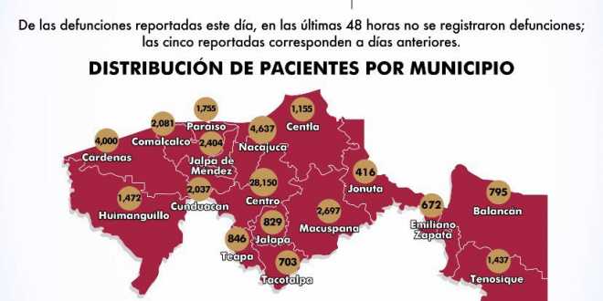 En la numeralia por municipios, Centro acumula 28 mil 150 casos; Nacajuca registra 4 mil 637; Cárdenas, 4 mil personas contagiadas; Macuspana totaliza 2 mil 697 casos; y Jalpa de Méndez, 2 mil 404 casos.