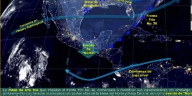 El Instituto de Protección Civil del Estado de Tabasco (IPCET), informa que la masa de aire asociada al Frente Frío número 36 mantendrá cielo nublado con lloviznas generalizadas a lluvias moderadas aisladas de 5.1 a 25 milímetros (mm) en La Chontalpa y Sierra.