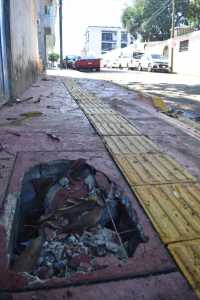 El diseño de las banquetas, a favor de los débiles visuales, se ve afectado por estas peligrosas alcantarillas