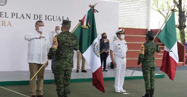 Acompañado por los jefes del Estado Mayor de la Trigésima Zona Militar, Román Villalvazo Barrios y de la Quinta Zona Naval Militar, José Luis Díaz Aragón, así como del secretario de Gobierno, José Antonio de la Vega Asmitia, el mandatario también realizó el abanderamiento a escoltas de las secretarías de Educación, Salud y Cultura.