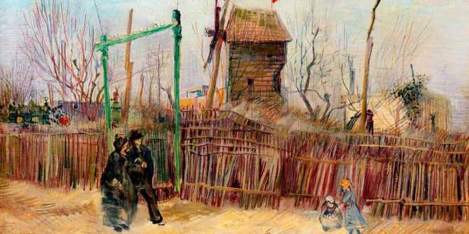 La obra «Escena de calle en Montmartre (Callejón de los dos hermanos y del Molino de Pimienta)» fue pintada en 1887 durante el período que Van Gogh pasó en París, y muestra a una pareja paseando por la parisina colina de Montmartre.