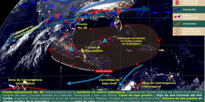 Para este viernes se esperan vientos del este y sureste de 15 a 20 kilómetros por hora (km/h) con rachas de 30 a 40 km/h, así como ambiente cálido con temperaturas máximas de 31 a 34 grados centígrados y mínimas de 19 a 21grados.