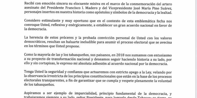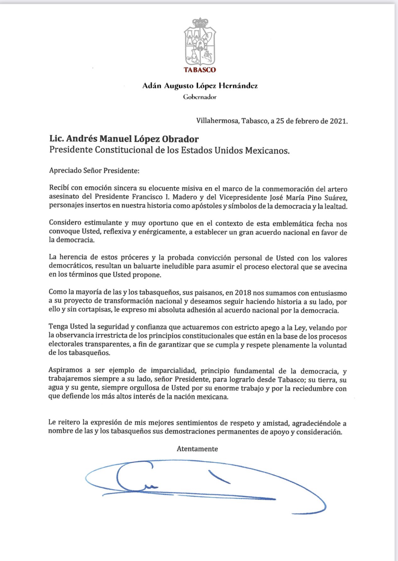 A través de una carta que envió este 25 de febrero al titular del Ejecutivo Federal, López Hernández dejó impreso el interés y compromiso de su gobierno de actuar con absoluto respeto a la Constitución Política y las Leyes Electorales del país.