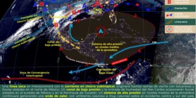 Indicó que este sábado se espera cielo mayormente despejado sin posibilidad de lluvia, debido a una circulación anticiclónica a niveles medios de la atmósfera, con vientos del este y sureste de 10 a 15 lisímetros por hora (km/h) y rachas de 20 a 40 km/h, así como ambiente caluroso con temperaturas máximas de 33 a 36 grados centígrados y mínimas de 20 a 22 grados.