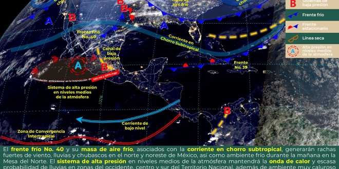 Se esperan vientos del este y noreste de 15 a 30 kilómetros por hora (km/h), así como ambiente cálido a caluroso con temperaturas máximas de 30 a 34 grados centígrados y mínimas de 20 a 22 grados.