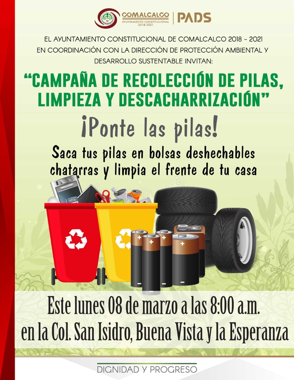Hoy lunes 8 de marzo se llevará acabo la campaña de recolección de pilas, limpieza y descacharrización en las colonias San Isidro, Buenavista y La Esperanza.