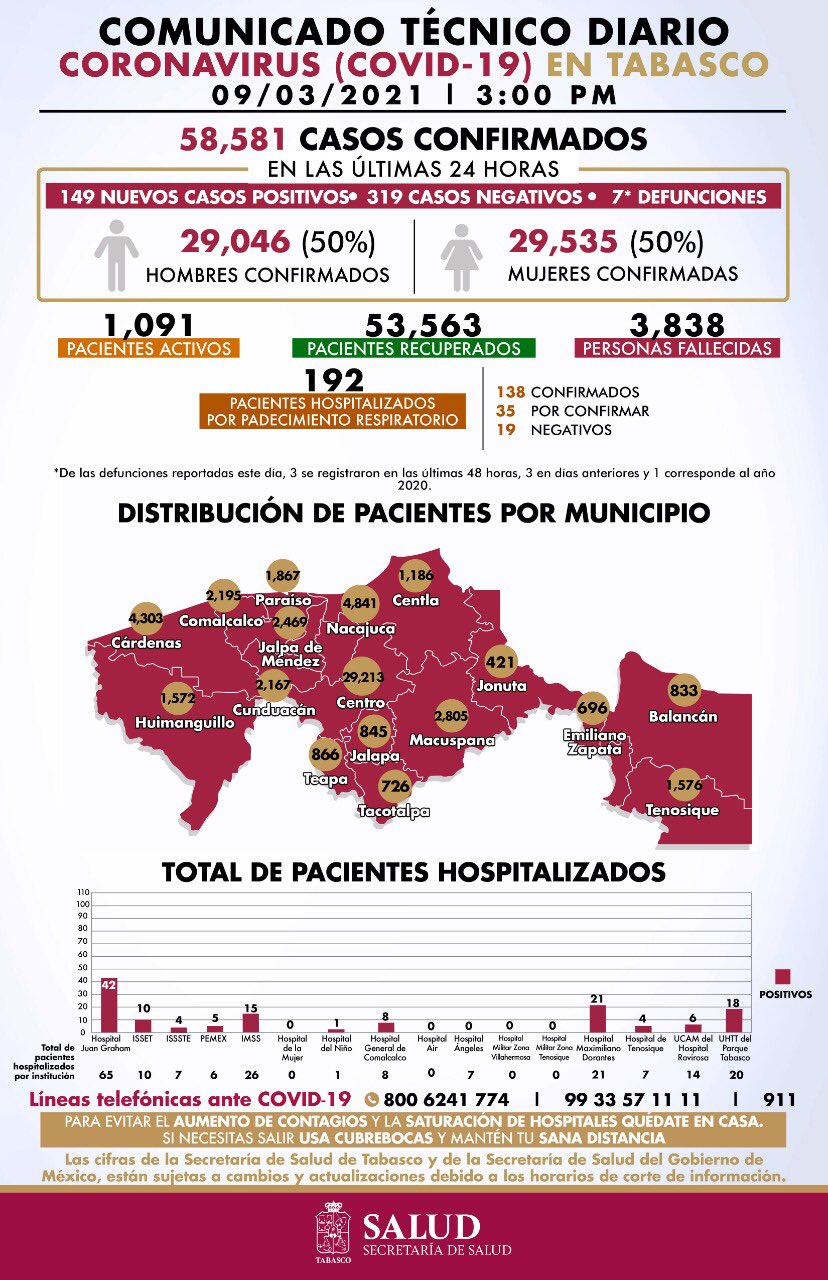 En la numeralia por municipios, Centro acumula 29 mil 213 casos; Nacajuca registra 4 mil 841; Cárdenas, 4 mil 303 personas contagiadas; Macuspana totaliza 2 mil 805 casos; y Jalpa de Méndez, 2 mil 469 casos.