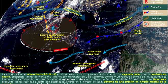 El organismo precisa en su reporte diario que estas lluvias pueden presentarse de manera nocturna y de corta duración, con vientos del este y noreste 15 a 30 kilómetros por hora. Se prevén temperaturas máximas de 30 a 33 grados centígrados y mínimas de 20 a 22 grados.