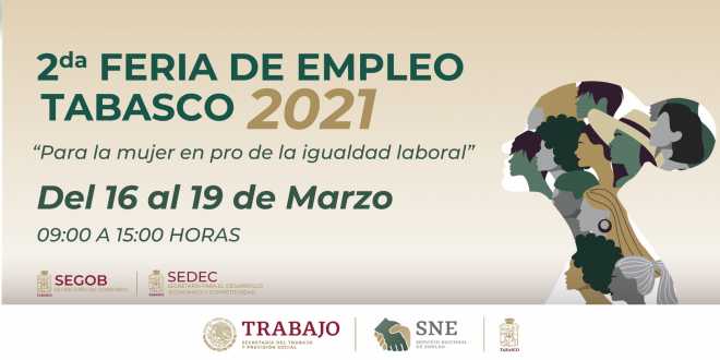 Para propiciar la participación en el ámbito laboral e impulsar el empoderamiento económico de las mujeres de la entidad, el Servicio Nacional de Empleo en Tabasco (SNET) en colaboración con la Secretaría para el Desarrollo Económico y la Competitividad (Sedec), convocan a la Segunda Feria de Empleo Tabasco 2021 dirigida al sector femenino, la cual se realizará del 16 al 19 de marzo.