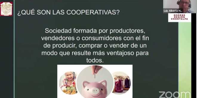 Durante el evento virtual transmitido desde la Fan Page del IFAT, el también coordinador de la organización “Nodess Región Chontalpa” inició la plática con la definición de las cooperativas que -dijo- son una sociedad formada por productores, vendedores, consumidores con el fin de producir, comprar o vender de modo que resulte más ventajoso para todos; manifestó que las cooperativas deben basarse en valores de ayuda mutua que permita el crecimiento de manera conjunta de todos sus integrantes.