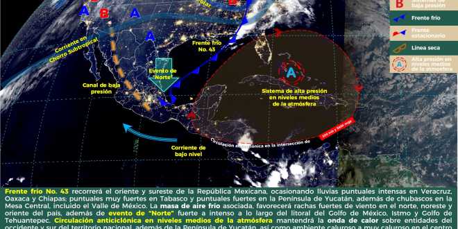 Lluvias muy fuertes de 50.1 a 75 milímetros a intensas aisladas de 75.1 a 150 milímetros en las subregiones Sierra, Macuspana y Huimanguillo, se prevén para este jueves, debido al frente frío número 43 y la masa de aire que lo impulsa.