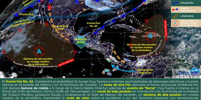 Explicó que se espera cielo nublado, vientos del Norte y Noreste de 20 a 40 kilómetros por hora, con rachas de 50 a 60 kilómetros por hora, así como oleaje de uno a tres metros en las costas, por lo que pidió tomar precauciones a pescadores.