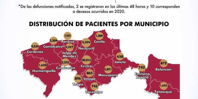 En cuanto a la distribución de casos por municipios, la Secretaría de Salud indicó que 30 mil 016 registra el municipio de Centro; le sigue Nacajuca con 4 mil 999; Cárdenas con 4 mil 534; Macuspana con 2 mil 891; Jalpa de Méndez con 2 mil 527; Comalcalco con 2 mil 304; Cunduacán 2 mil 252; Paraíso con mil 951; Tenosique mil 693; Huimanguillo con mil 628; Centla con mil 209; Teapa con 896; Jalapa con 865; Balancán 872; Tacotalpa 743; Emiliano Zapata 742 y Jonuta con 430 casos.