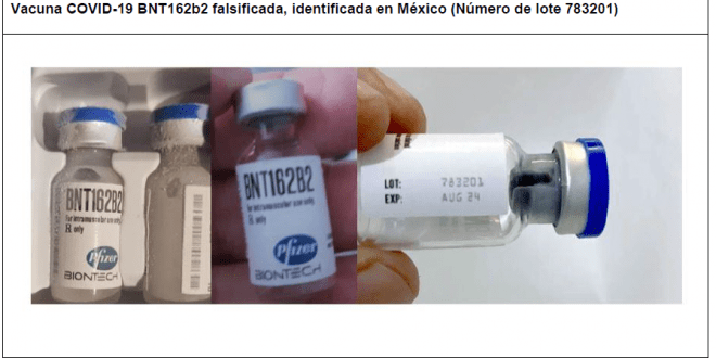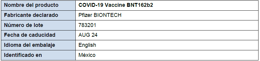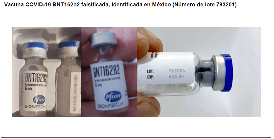 Esta alerta de la OMS sobre productos médicos se refiere a la vacuna COVID-19 falsificada, identificada como «BNT162b2», detectada en México en febrero de 2021 y cuya falsificación se ha confirmado recientemente a la OMS. El producto falsificado fue suministrado y administrado a pacientes fuera de los programas de vacunación autorizados.