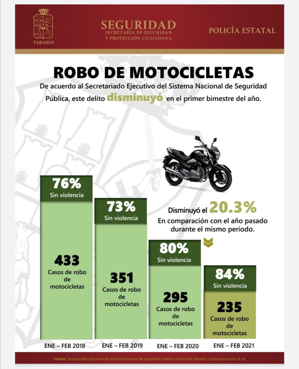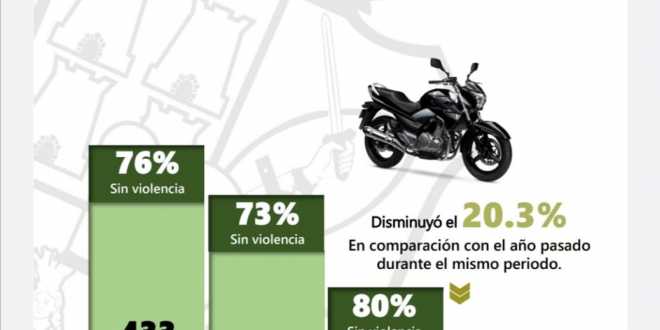 En el robo de motocicletas sin violencia, hubo 235 delitos registrados en enero-febrero 2021, en tanto en el mismo periodo de 2020, hubo 295, lo que representa una disminución de más del 20 por ciento.
