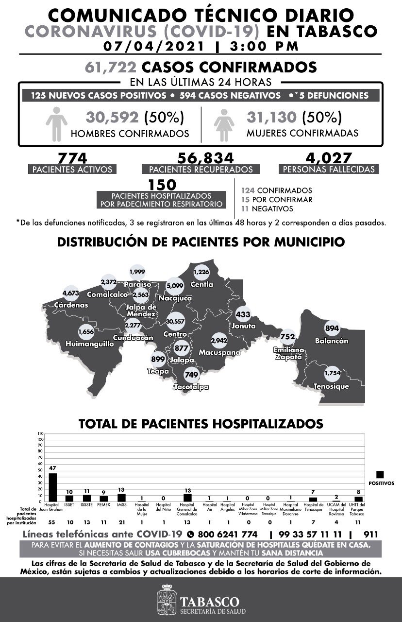 En su comunicado técnico diario, para dar a conocer los avances del COVID-19 en Tabasco, con corte a las 3:00 pm., precisa que del total de pacientes hospitalizados, 55 se encuentran en el Hospital Regional de Alta Especialidad “Dr. Juan Graham Casasús”; 21 en el IMSS; 13 en el Hospital Regional de Comalcalco e igual número en el ISSSTE.