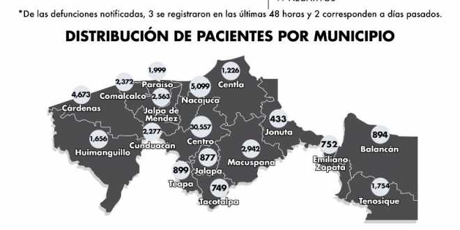 En cuanto al Covid-19 por municipios, 30 mil 557 registra el municipio de Centro; le sigue Nacajuca con 5 mil 099; Cárdenas con 4 mil 673; Macuspana con 2 mil 942; Jalpa de Méndez con 2 mil 563, Comalcalco con 2 mil 372; Cunduacán con 2 mil 277; Paraíso con mil 999; Tenosique con mil 764; Huimanguillo con mil 656; Centla con mil 226; Teapa con 899; Jalapa 877; Balancán 894; Tacotalpa 749; Emiliano Zapata 752 y Jonuta con 433 casos.