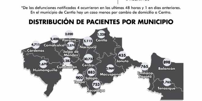 En la numeralia por municipios, Centro acumula 30 mil 737 casos; Nacajuca registra 5 mil 115; Cárdenas, 4 mil 711 personas contagiadas; Macuspana totaliza 2 mil 969 casos; y Jalpa de Méndez, 2 mil 574 casos.