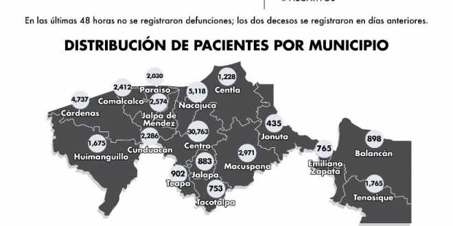 En cuanto al número de pacientes por municipio, añade que Centro registra 30 mil 763 casos positivos; Nacajuca, 5 mil 118; Cárdenas, 4 mil 737; Macuspana, 2 mil 971; Jalpa de Méndez, 2 mil 574; Comalcalco, 2 mil 412; y Cunduacán, 2 mil 286.