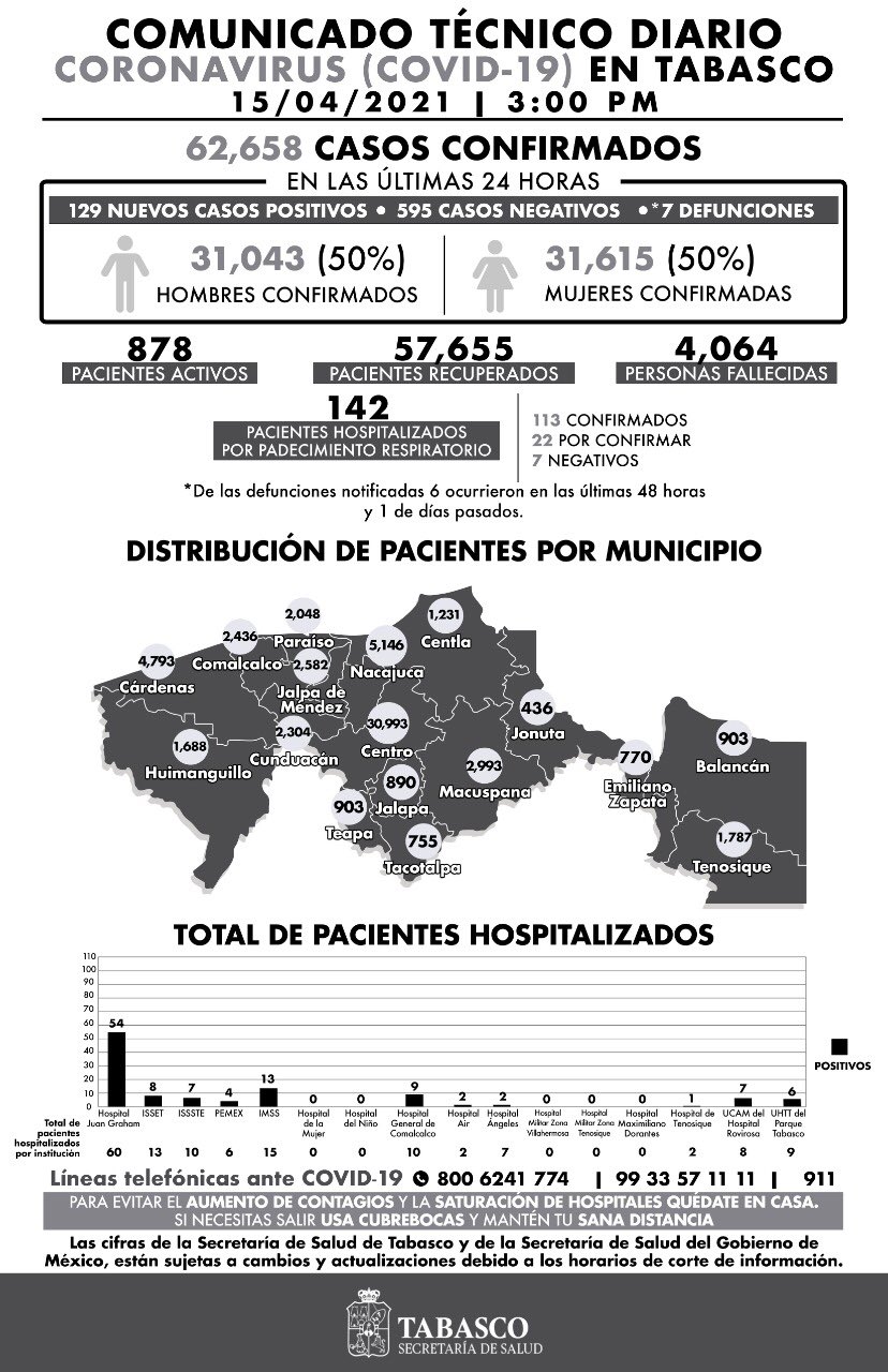 De acuerdo al Comunicado Técnico Diario, Tabasco registra 62 mil 658 casos confirmados, 4 mil 64 fallecimientos por SARS-CoV-2, así como 57 mil 655 pacientes recuperados, 878 activos y 142 hospitalizados por padecimientos respiratorios, de los cuales 113 resultaron positivos, 22 esperan los resultados de sus pruebas PCR y siete negativos.