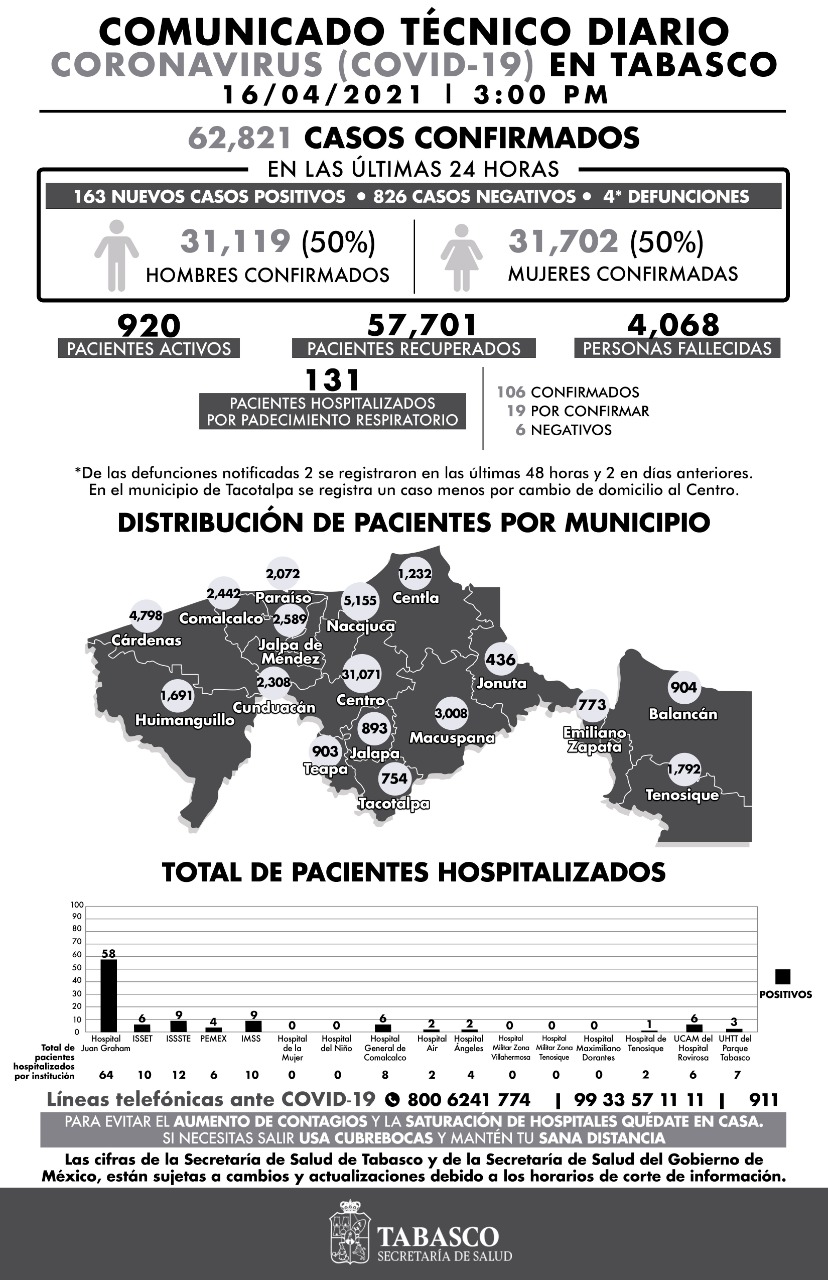 Con el llamado a mantener hoy más que nunca las medidas sanitarias y de protección para evitar una tercera ola de contagios de COVID-19, la Secretaría de Salud reportó este viernes 163 nuevos casos, con lo que el total de tabasqueños infectados ascendió a 62 mil 821 casos, en tanto que la cifra de fallecidos a causa de esta enfermedad llegó a 4 mil 68 personas.