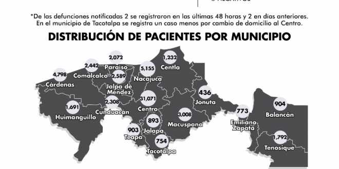 Respecto a la distribución de pacientes por municipio, Centro acumuló 31 mil 071 casos; Nacajuca, 5 mil 155; Cárdenas, 4 mil 798; Macuspana, 3 mil 008; Jalpa de Méndez, 2 mil 589; Comalcalco, 2 mil 442; Cunduacán, 2 mil 308; Paraíso, 2 mil 72; Tenosique, mil 792; Huimanguillo, con mil 691; Centla, mil 232; Balancán y Teapa, con 903; Jalapa, 893; Emiliano Zapata, 773; Tacotalpa, 754; y Jonuta, 436.
