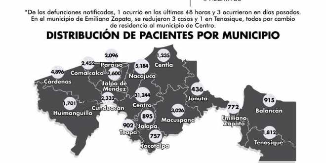 En cuanto al COVID-19 por municipios, 31 mil 244 registra el municipio de Centro; le sigue Nacajuca con 5 mil 184; Cárdenas con 4 mil 896; Macuspana con 3 mil 026; Jalpa de Méndez con 2 mil 600, Comalcalco con 2 mil 452; Cunduacán con 2 mil 332; Paraíso con 2 mil 096; Tenosique con mil 812(se redujo un caso por cambio de domicilio al municipio de Centro); Huimanguillo con mil 701; Centla con mil 235; Teapa con 902; Jalapa 895; Balancán 915; Tacotalpa 757; Emiliano Zapata 773 (se redujeron tres casos por cambio de domicilio al municipio de Centro) y Jonuta con 436 casos.
