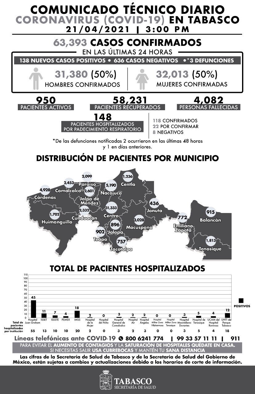 En su Comunicado Técnico Diario para dar a conocer los avances de la COVID-19 en Tabasco con corte a las 3:00 de la tarde precisa que del total de pacientes hospitalizados, 55 se encuentran en el Hospital Regional de Alta Especialidad “Dr. Juan Graham Casasús”; 20 en el IMSS; 18 en la Unidad de Hospitalización Temprana de Tabasco (UHTT) del Parque Tabasco; 13 en el ISSET; 10 en el ISSSTE y misma cifra en el Hospital Regional de Pemex.