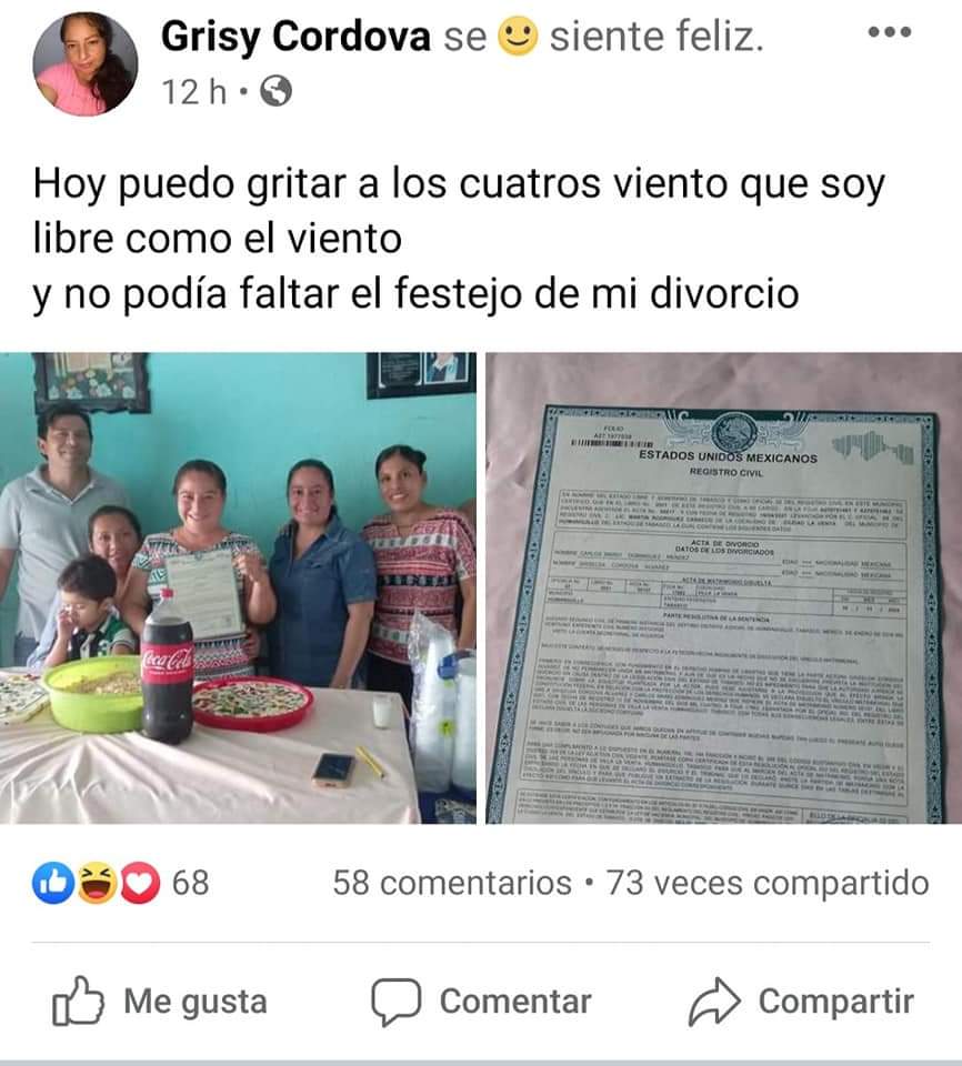 Este fue el mensaje que compartió en su cuenta de #Facebook: Hoy puedo gritar a los cuatros viento que soy libre como el viento y no podía faltar el festejo de mi divorcio.