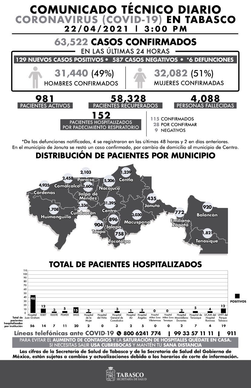 De acuerdo con el Comunicado Técnico Diario emitido por el sector, que abarca de las 3 de la tarde de ayer miércoles a la misma hora de hoy, Tabasco acumuló un total de 63 mil 522 personas contagiadas en más de un año de emergencia sanitaria, de las que 58 mil 328 ya se recuperaron y vencieron a la enfermedad.