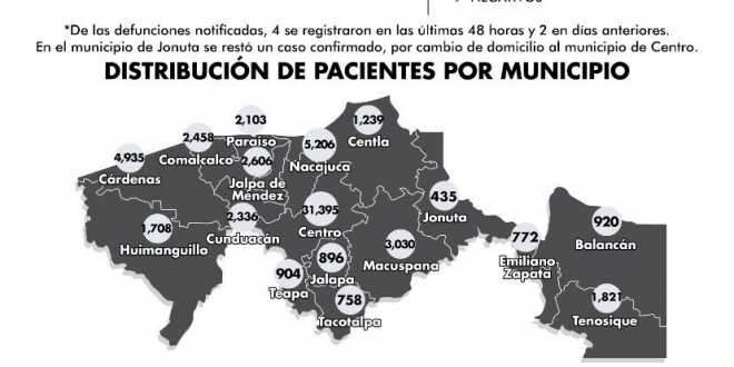Completan la distribución de casos los municipios de Tacotalpa con 758 contagiados; Emiliano Zapata con 772, y Jonuta, con 435 casos (se restó un caso por cambio de domicilio al municipio de Centro).