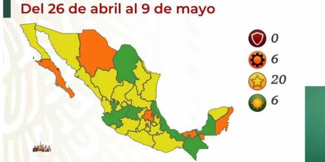 En comparación con la quincena pasada, cuando se registraron ocho estados en verde, el semáforo que tendría vigencia a partir del próximo lunes 26 de abril, tiene seis estados en nivel bajo de riesgo de contagio.