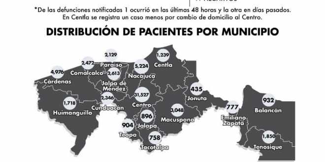 En la numeralia por municipios, Centro acumula 31 mil 527 casos; Nacajuca registra 5 mil 224; Cárdenas, 4 mil 976 personas contagiadas; Macuspana totaliza 3 mil 48 casos; y Jalpa de Méndez, 2 mil 613 casos.