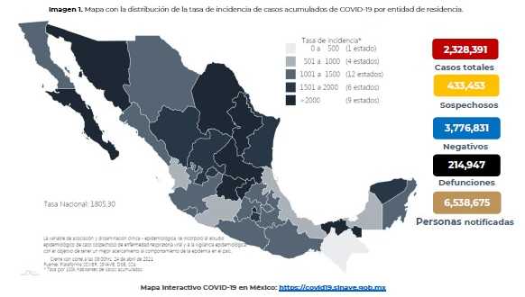 Al 25 de abril de 2021 hay 1,850,680 personas recuperadas de #COVID19 y 214,947 defunciones confirmadas.