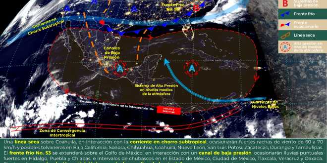 El Instituto de Protección Civil del Estado de Tabasco (IPCET) informó que debido a que un canal de baja presión en el Golfo de México interactúa con un sistema anticiclónico a niveles medio de la atmósfera, favorecerá lloviznas dispersas de 0.1 a 5 milímetros con mayor probabilidad en la Sierra.