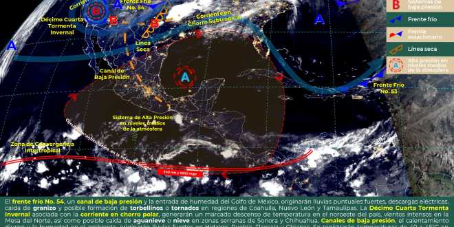 El Instituto informa que un canal de baja presión, limitado por una circulación anticiclónica a niveles medios de la atmósfera, favorecerá cielo despejado durante el día a parcialmente nublado por la noche, sin probabilidad de lluvias.