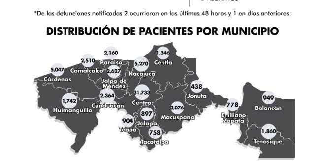 Completan la distribución de casos los municipios de Tacotalpa con 758 contagiados; Emiliano Zapata con 778, y Jonuta con 438 casos.