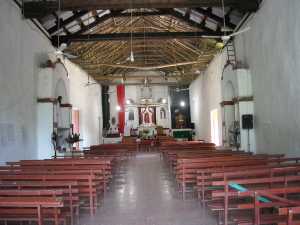 La iglesia está construida con piedra bola y cuenta con un acabado de mezcla aplanada. La nave del edificio tiene una cubierta de dos aguas, hecho de tejas con armadura de madera
