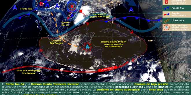 El Instituto de Protección Civil del Estado de Tabasco (IPCET) reporta que un canal de baja presión que interactúa con una masa de aire relativamente seca a niveles medios de la atmósfera favorecerá lloviznas dispersas con lluvias moderadas aisladas de 5.1 a 25 milímetros en La Sierra.