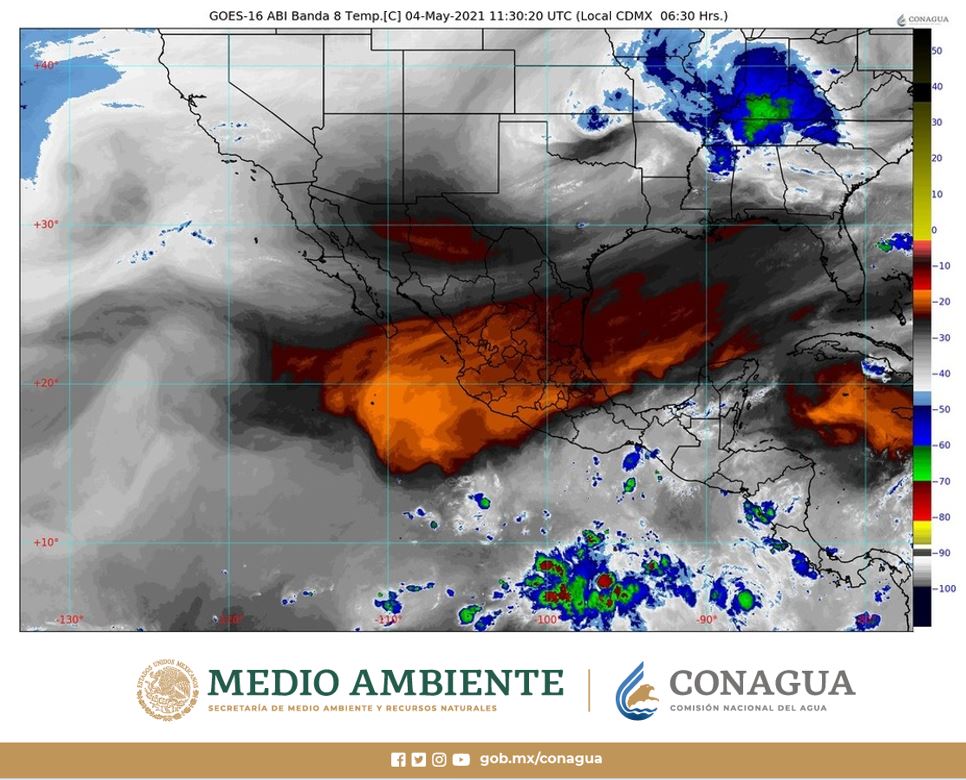 Las condiciones atmosféricas para el Pacífico Centro son ambiente de frío a fresco por la mañana y de caluroso a muy caluroso por la tarde. Se espera cielo despejado y viento del oeste y suroeste de 10 a 25 km/h, con rachas de hasta 50 km/h en Jalisco.
