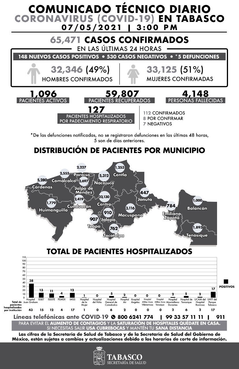 En su Comunicado Técnico Diario, este viernes, reportó 148 nuevos casos positivos de las últimas 24 horas, 530 negativos y cinco defunciones de días anteriores así como 127 pacientes hospitalizados por problemas respiratorios graves, en hospitales públicos y privados, de los cuales 112 están confirmados, 8 por confirmar y 7 son negativos.