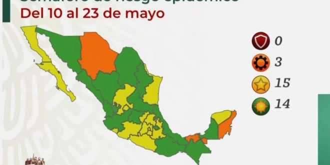 Son 15 los estados que se ubican en amarillo, de riesgo medio de contagio. Tan solo tres están en nivel alto de riesgo contagio de infección de coronavirus, y ninguno en el rojo.