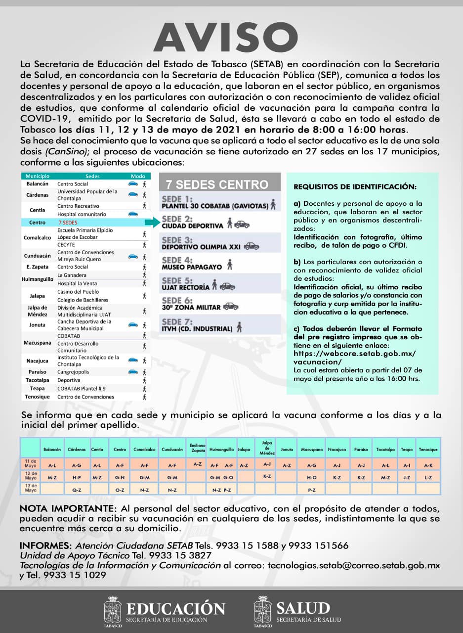 La Secretaría de Educación de Tabasco (Setab) en coordinación con la Secretaría de Salud, informó a los docentes y personal de apoyo a la educación, que laboran en el sector público, organismos descentralizados y en los particulares con autorización o validez oficial de estudios, que del 11 al 13 de mayo se llevará a cabo en todo el estado la aplicación de la vacuna contra la COVID-19.