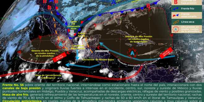 El Instituto de Protección Civil del Estado de Tabasco (IPCET), informó que, el Frente Frío No 56, con características de estacionario e interactuando con una masa de aire relativamente seca a niveles medios de la atmosfera y un canal de baja presión al oriente del Estado, favorecerá lluvias fuertes de 25.1 a 50 milímetros a muy fuertes aisladas de 50.1 a 75 milímetros en Chontalpa y Sierra.